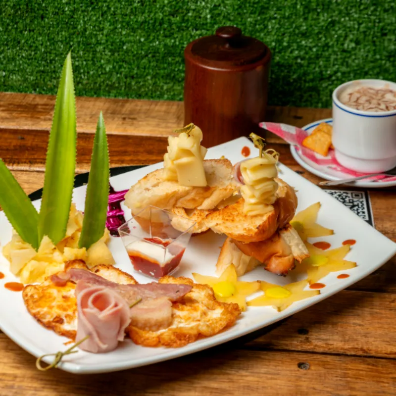 Dos huevos, tostadas, bacon, frutas, café o jugo