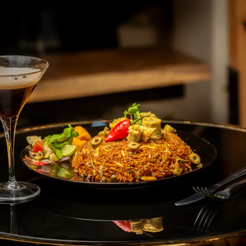 Arroz salteado con salsa china, bacón, tortilla, jamón visking, camarón, cebolla, ají, ajo porro y col..