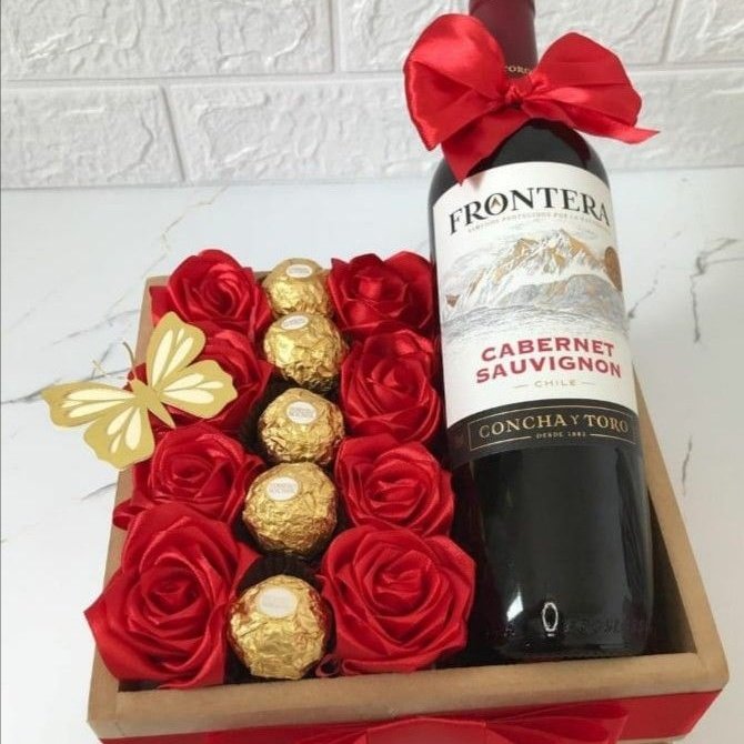 Caja corazón con vino, 6 rosas eternas y bombones  - Imagen principal