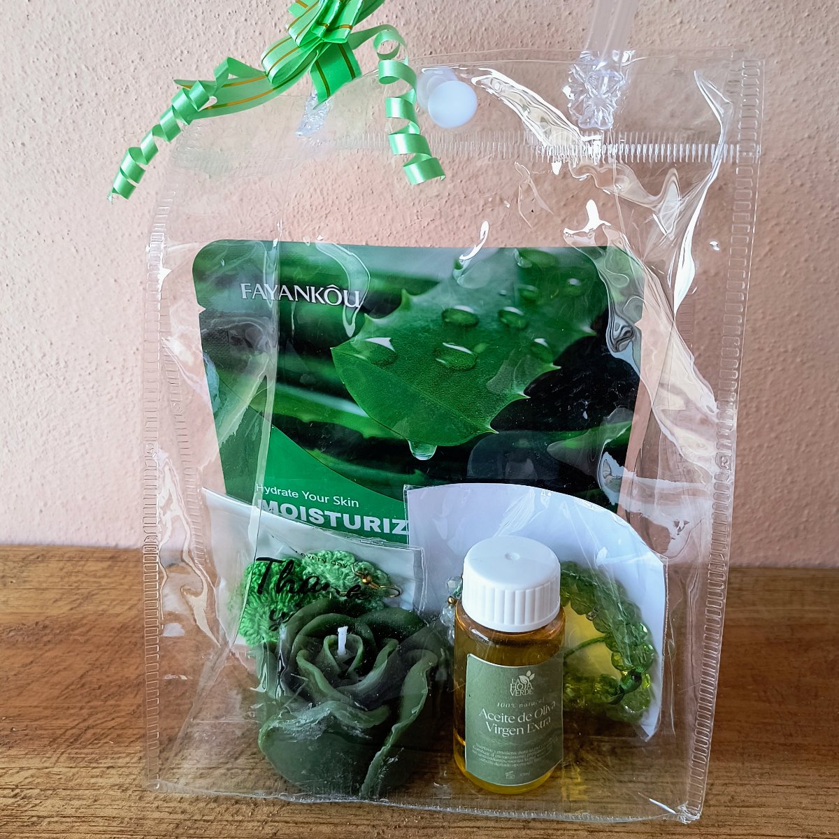 En este combo cuenta con: aceite de oliva extra virgen, una vela en forma de flor, mascarilla de áloe vera, aretes tejidos y pulsera. Puedes encontrar estos mismo productos por individual en nuestra tienda y ver sus características y propiedades.