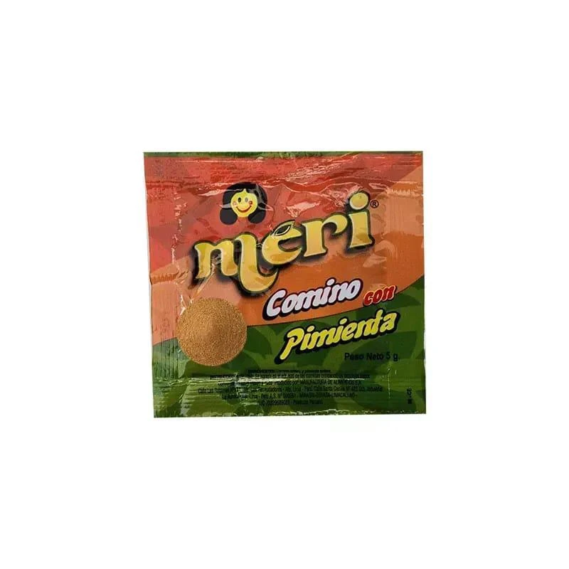 Comino con pimienta • Marca: Meri • País de producción: Perú • Formato de presentación: Bolsa plástica • Peso: 5g • Sazonador práctico y económico, ideal para dar un toque cálido y picante a tus comidas. Perfecto para uso diario en porcione • Ver más...