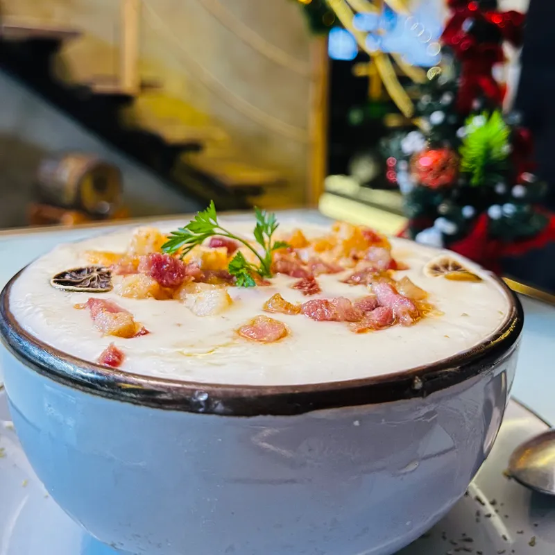 Crema de queso gouda con crujientes de bacon y camarones al estilo CONTA’S