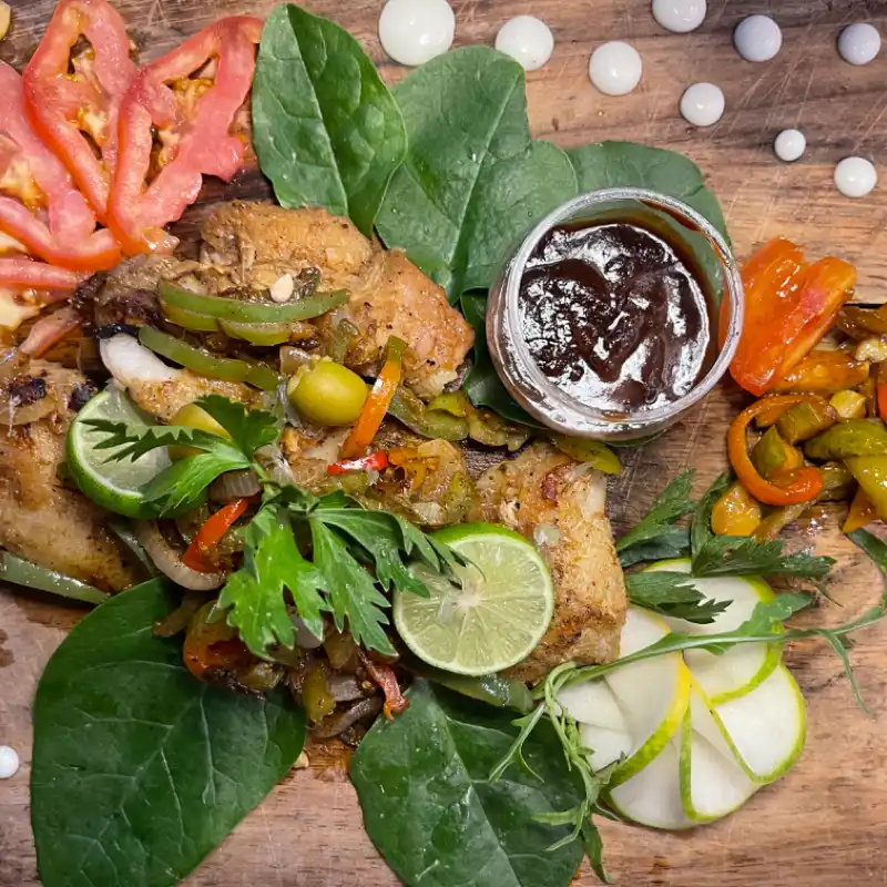 Rueda de pescado cocido a la plancha aromatizado con aceites y salteado de vegetales