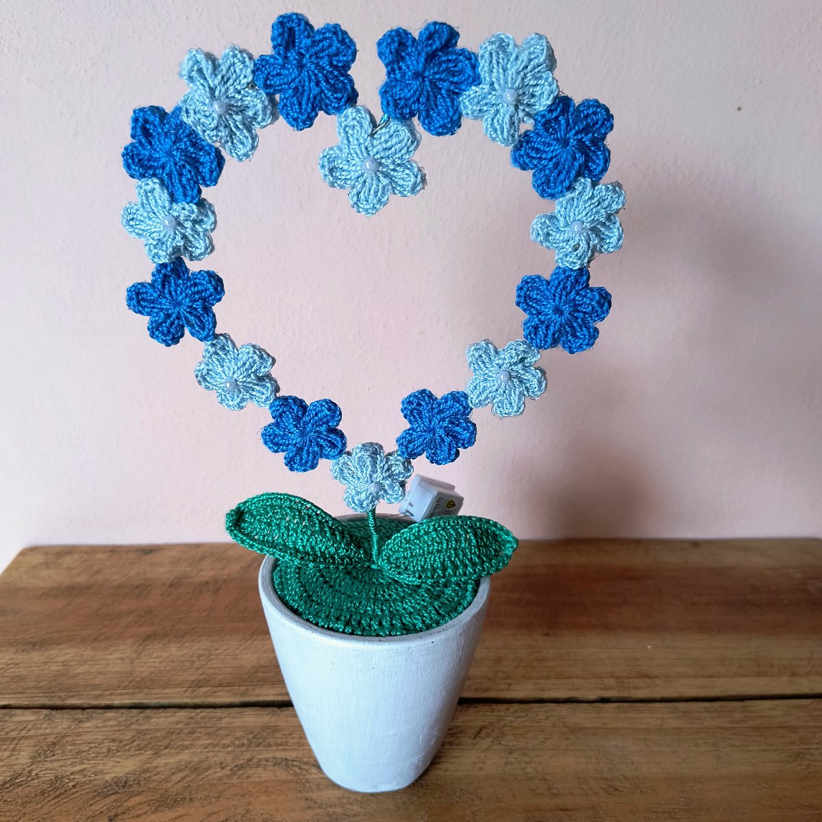 Flores tejidas en forma de corazón. Cuenta con pequeñas luces led en varios modos