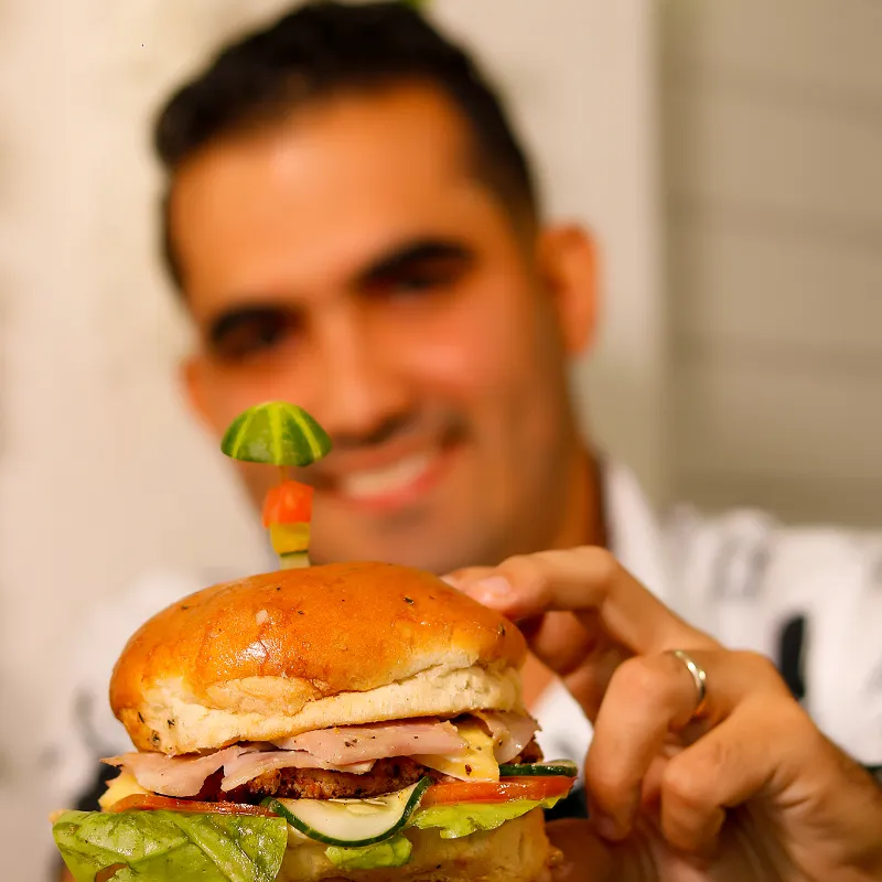(Hamburguesa de carne, queso gouda y vegetales)