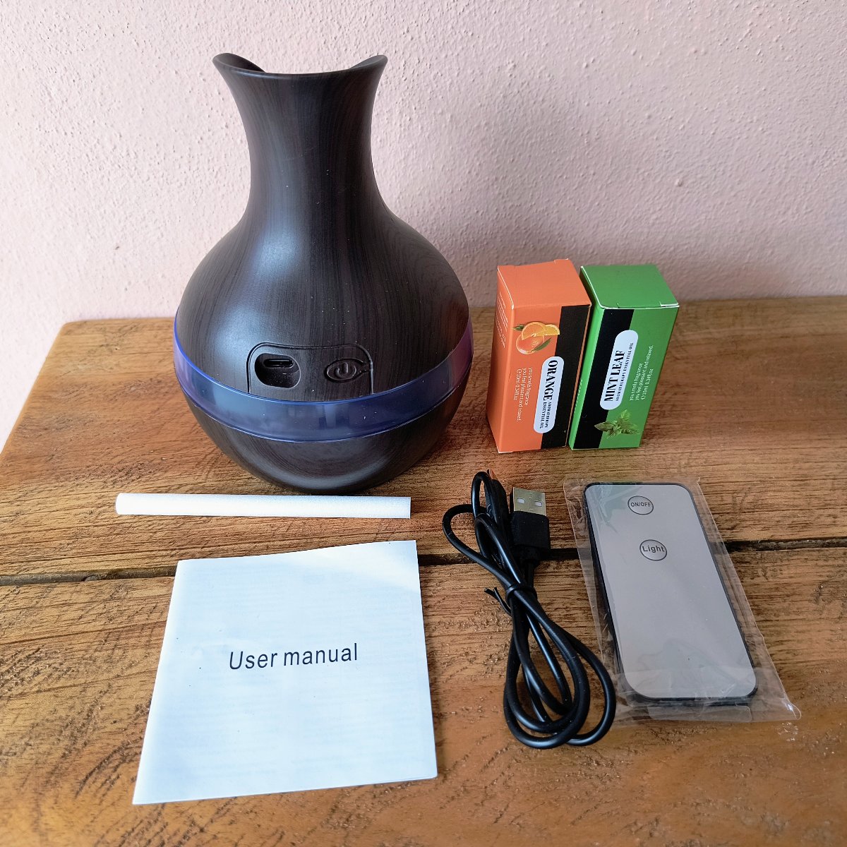 Juego de humidificar con esencias de naranja y menta. Cuneta con un manual con las instrucciones de uso, el cable cargador y un mando a distancia.