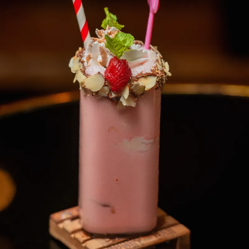Batido con mermelada de fresa, licor de cookies, helado de fresa, tequila de fresa, crema de leche y ron blanco. Servido en vaso cuadrado con hielo, crusta de Nutella con galletas, nata y fresa fresca.