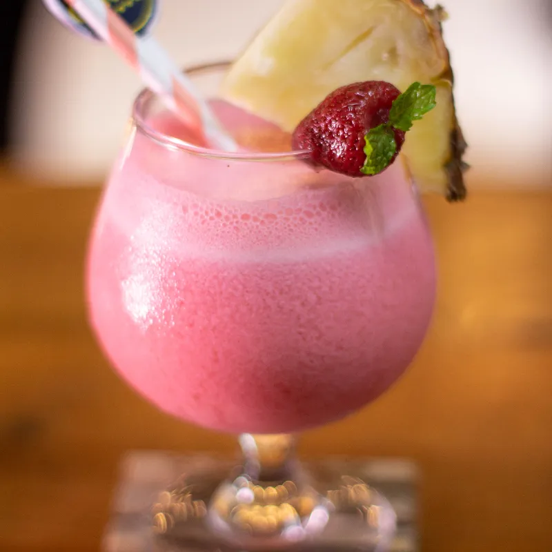 De brillante color rosa, compuesto por vodka, zumo de piña, granadina y crema de leche.