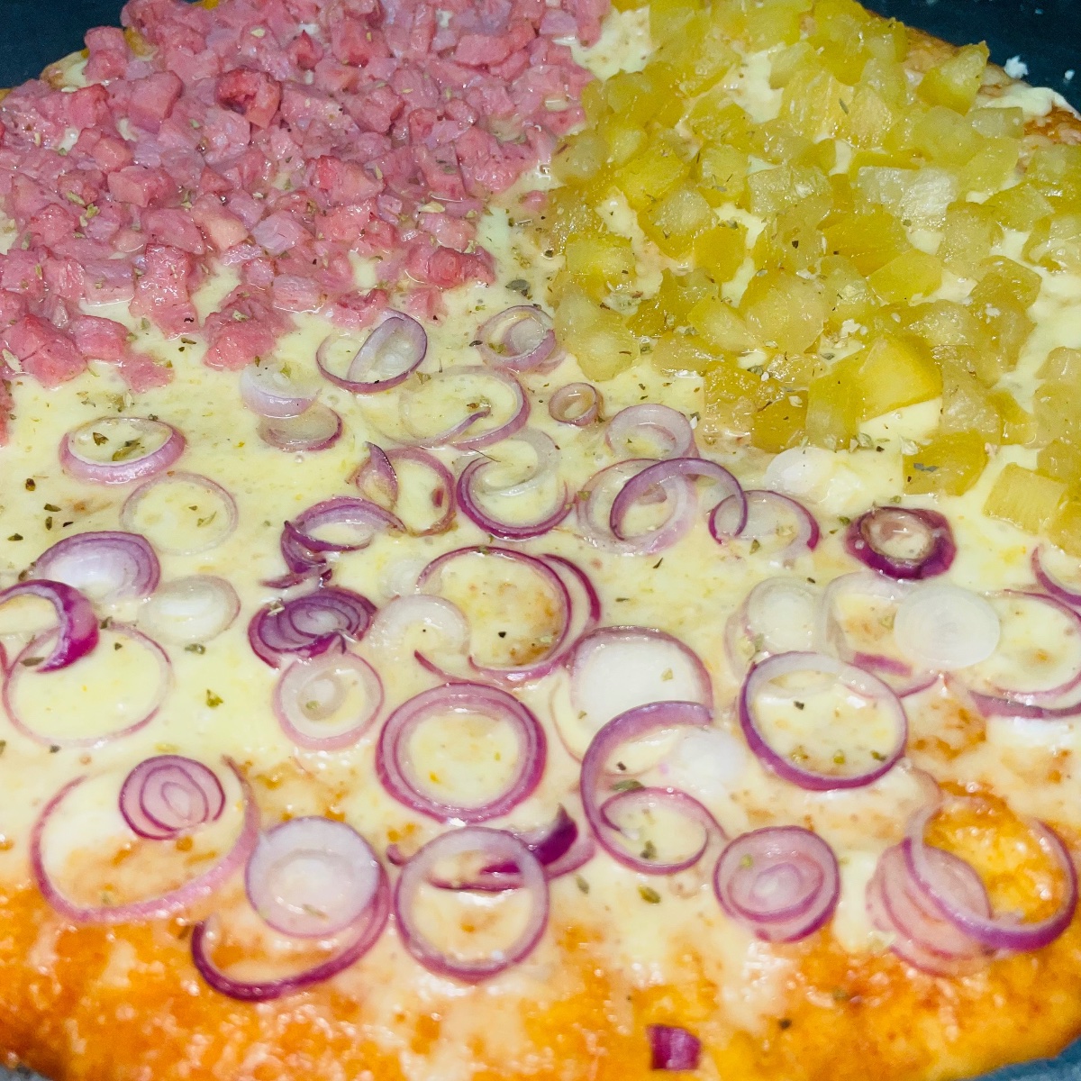 Pizza de Queso Blanco con agregos de Jamón, Piña, Cebolla, Aceituna ( Puede sustituir cualquier agregó por algún otro de nuestro menú)
