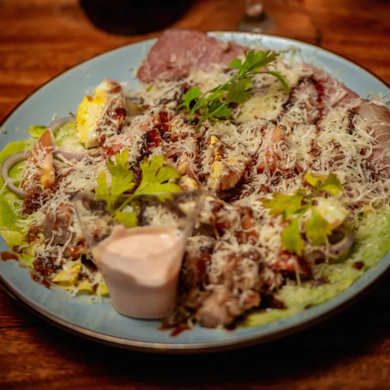 Una ensalada completa y llena de sabor: fresca cama de lechugas, jugoso bistec de pollo a la plancha , tiras de bacon o jamón pierna crujiente, huevo cocido en su punto, queso gouda en cubos rayado , tomate fresco, cebolla, pepino, perejil y un aderezo especial que equilibra cada bocado.