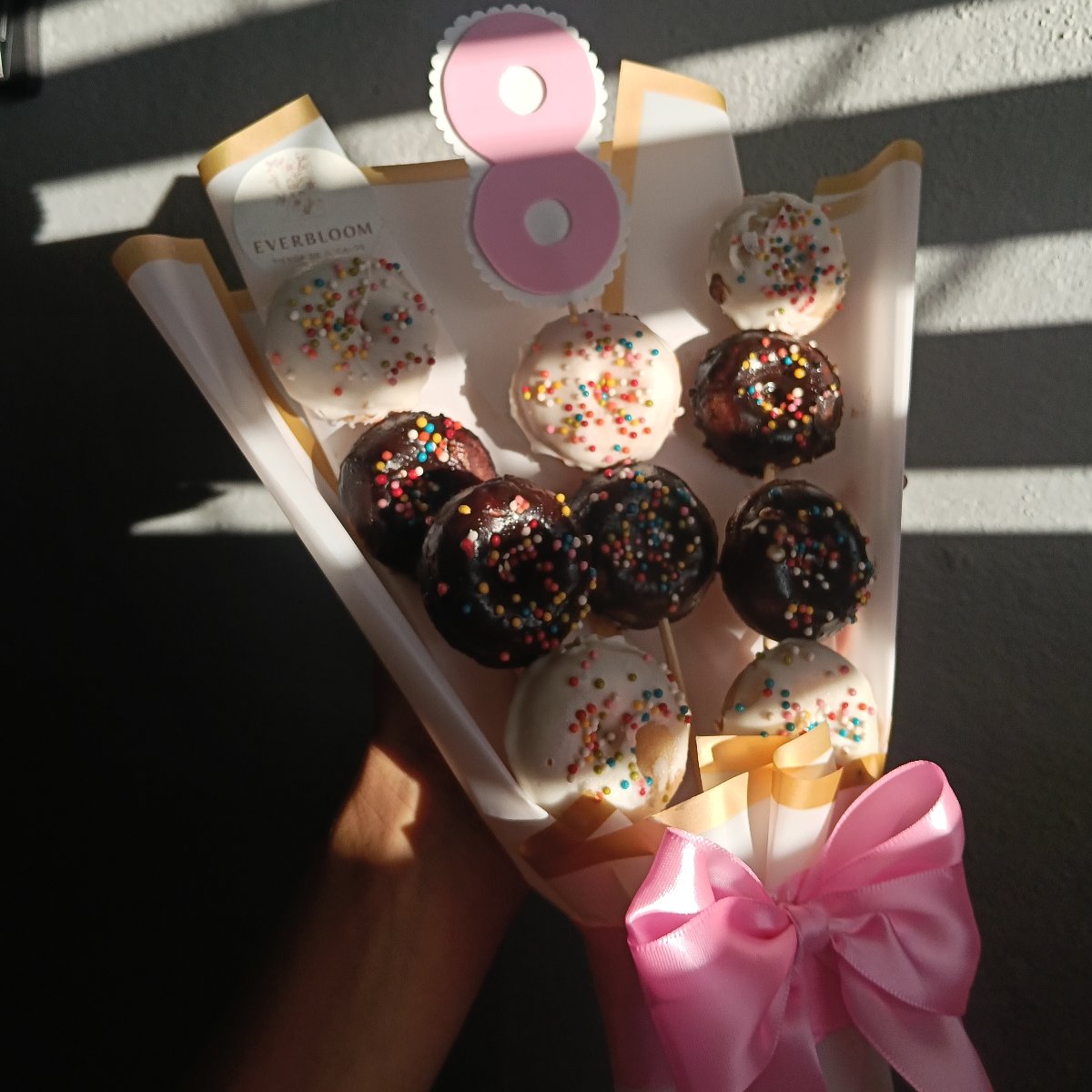 Disponibles varios colores de envoltura y para los lazos, incluye un detalle en foamy Mini donas de chocolate blanco y chocolate negro😋🍩
