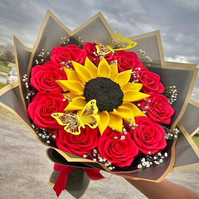 Ramo de 10 rosas y 1 girasol