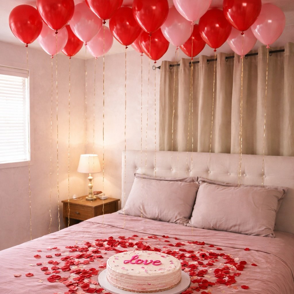 Decoración con: • 20 globos y serpentinas • 25 pétalos • Dulce decorado