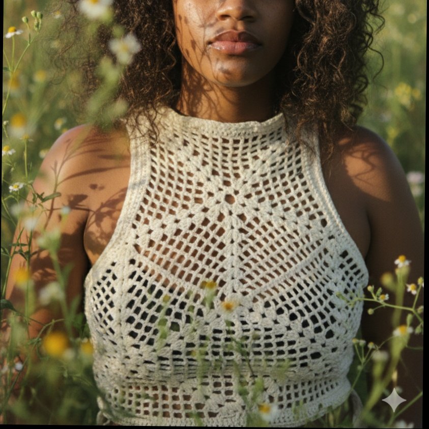 Top en crochet reversible que ofrece dos estilos en una sola prenda. Su diseño artesanal con apliques aporta un toque distintivo y elegante, mientras que la versatilidad del reverso permite adaptarlo a diferentes ocasiones con frescura y comodidad.