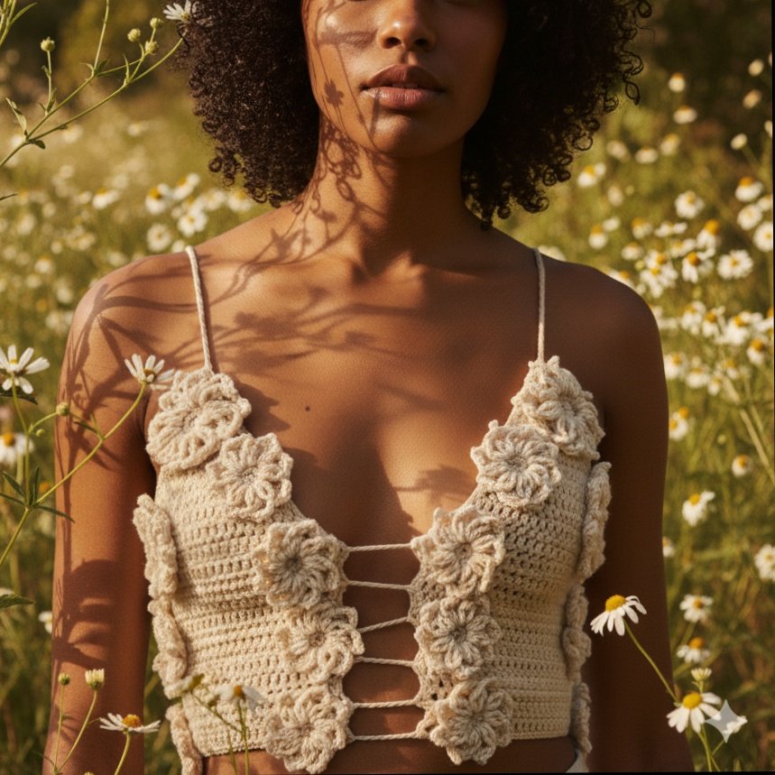 Top tejido en crochet con diseño de puntos altos tupidos y decorado con flores, estiliza la figura y aporta un aire moderno y sofisticado. Su textura artesanal ofrece frescura y comodidad, realza la silueta con un toque elegante y versátil. □ T a l l a s d i s p o n i b l e s : XS, S , M , L □ C o l o r e s d i s p o n i b l e s :